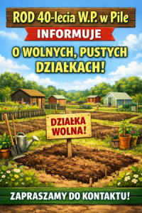 Informujemy że ZARZĄD ROD IM.40LECIA w Pile posiada działki na zagospodarowanie (puste) z możliwością nabycia prawa do użytkowania działek ogrodowych. Jeśli marzy Ci się własny kawałek zieleni-zapraszamy!