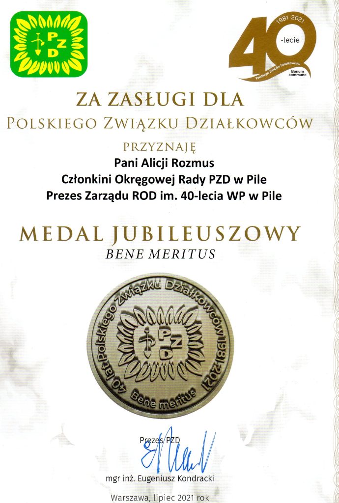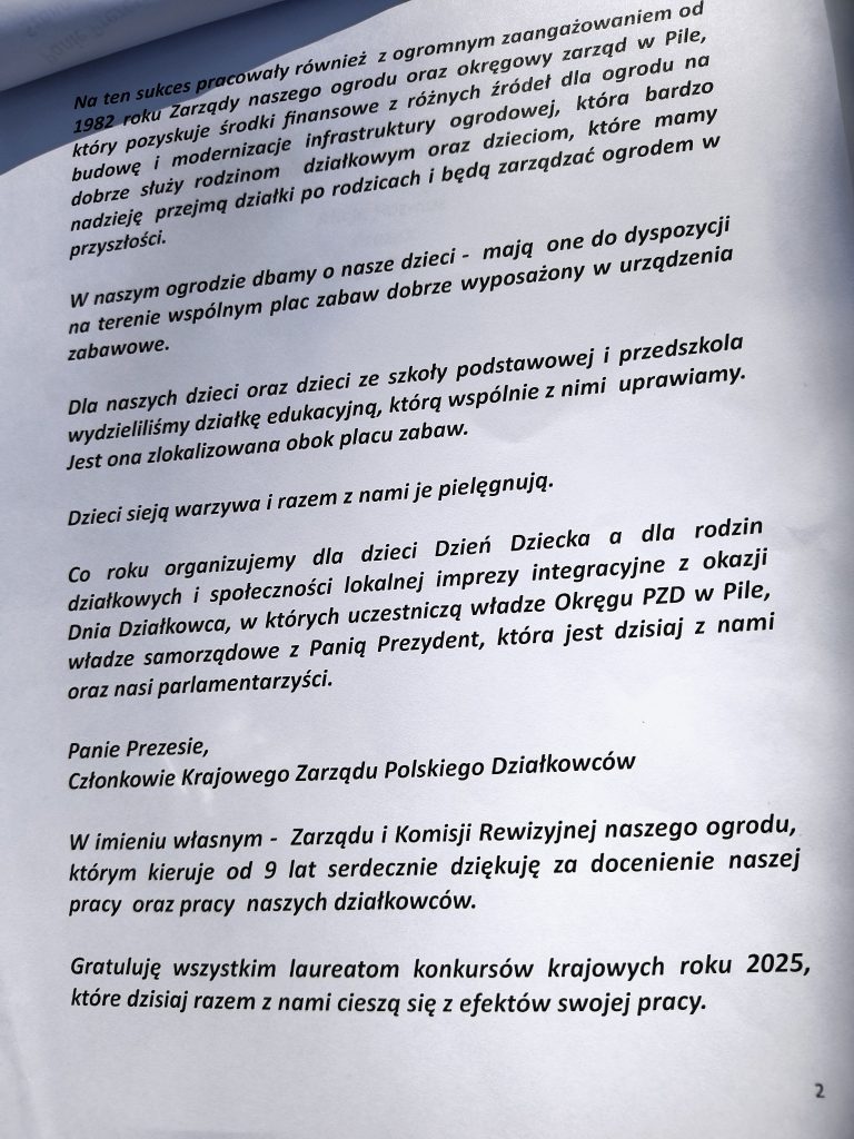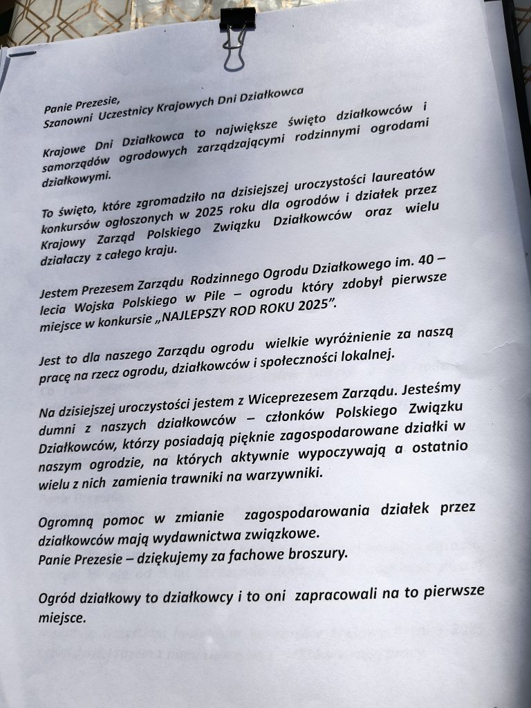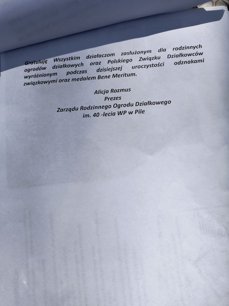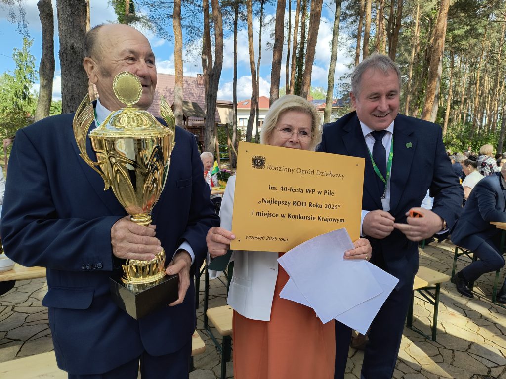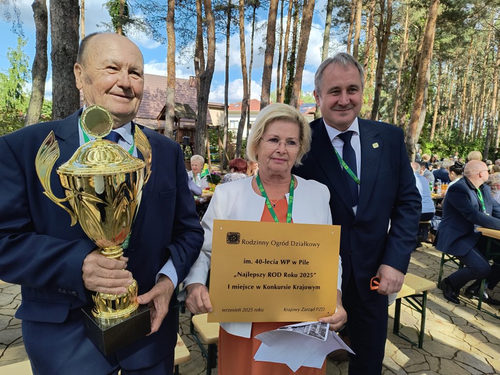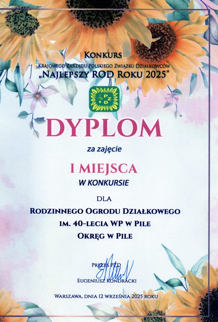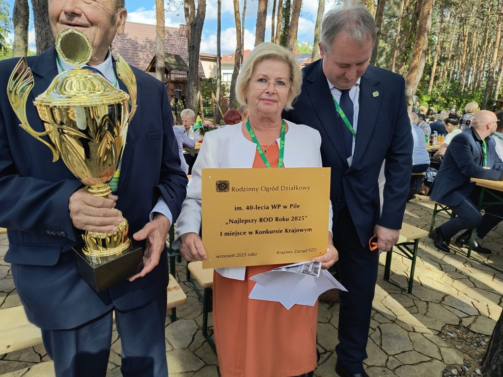 Wręczenie nagrody za zajęcie I MIEJSCA w Ogólno Krajowym Konkursie ROD. Najlepszy ROD roku 2025 to ROD 40LECIA WP W PILE. Nagroda została wręczona na Uroczystości w Krajowym Zarządzie PZD w WARSZAWIE 12 wrzesień 2025. Ngrodę odebrali Pani Prezes Alicja Rozmus i V-ce Prezes Jerzy Semeniuk. Nagrodę ufundowaną 12000zł wręczył Prezes KZ PZD Eugeniusz Kondracki oraz otrzymaliśmy baner , tablicę pamiątkową i dyplom. Za zasługi dla członkini OR PZD Pani Prezes Alicji Rozmus został wręczony medal jubileuszowy BENE MERITUS